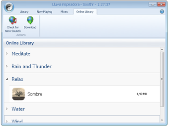 Soothr es un reproductor de sonidos relajantes. En su librería, ampliable mediante descargas, encontrarás clips pertenecientes a varias categorías: meditación, lluvia y truenos, relax, agua y viento. Haz doble clic sobre uno de ellos para que Soothr lo reproduzca.